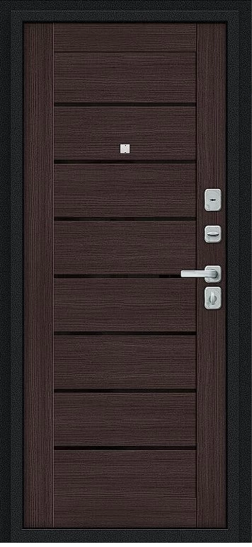 Надежная входная Дверь Браво Техно/BChrome Букле черное/Wenge Melinga премиум класса по цене 34 699 руб. Большая толщина стали защитит от проникновения в ваш дом, квартиру или коттедж. Используется очень качественная фурнитура: замки, цилиндры, ручки, защелки. Покрытие и отделка двери изготовлено под внимательным контролем производителя. Дверь имеет долгий срок службы и гарантию.